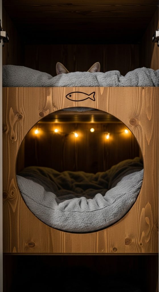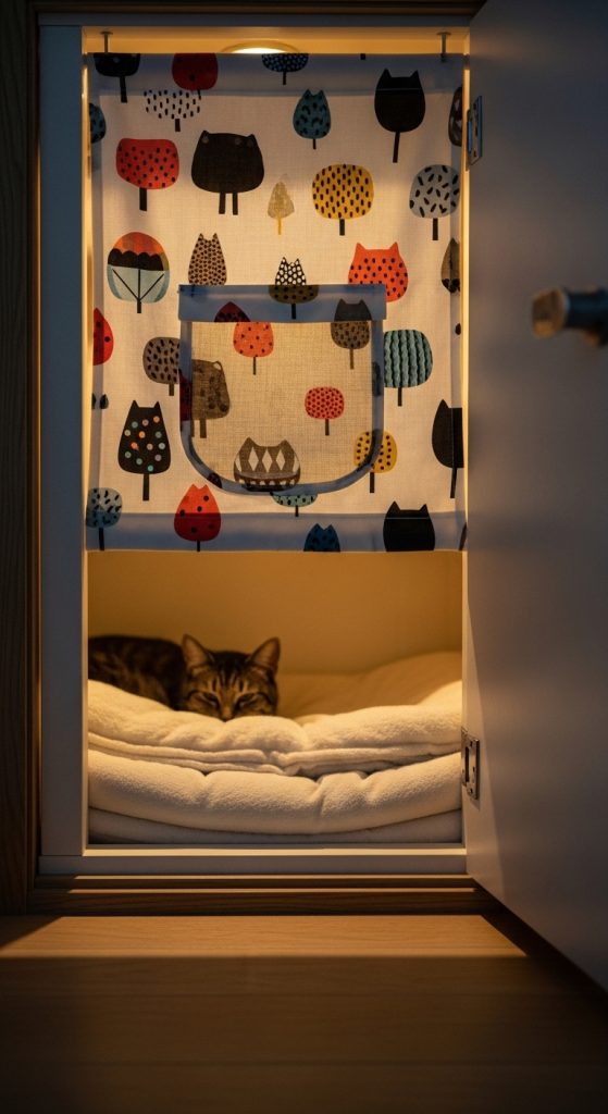 Use a small curtain or fabric door to give your cat a sense of privacy while keeping the nook visually appealing.