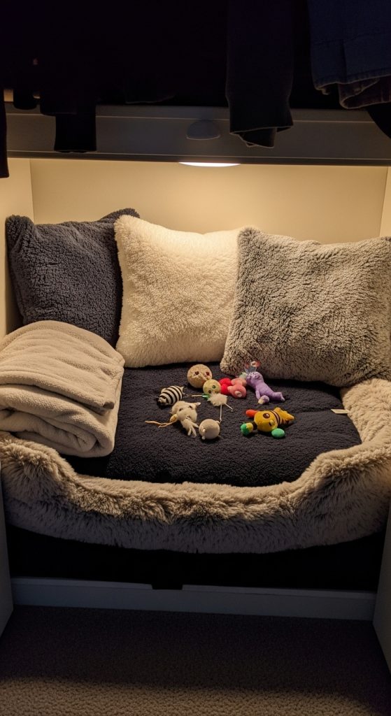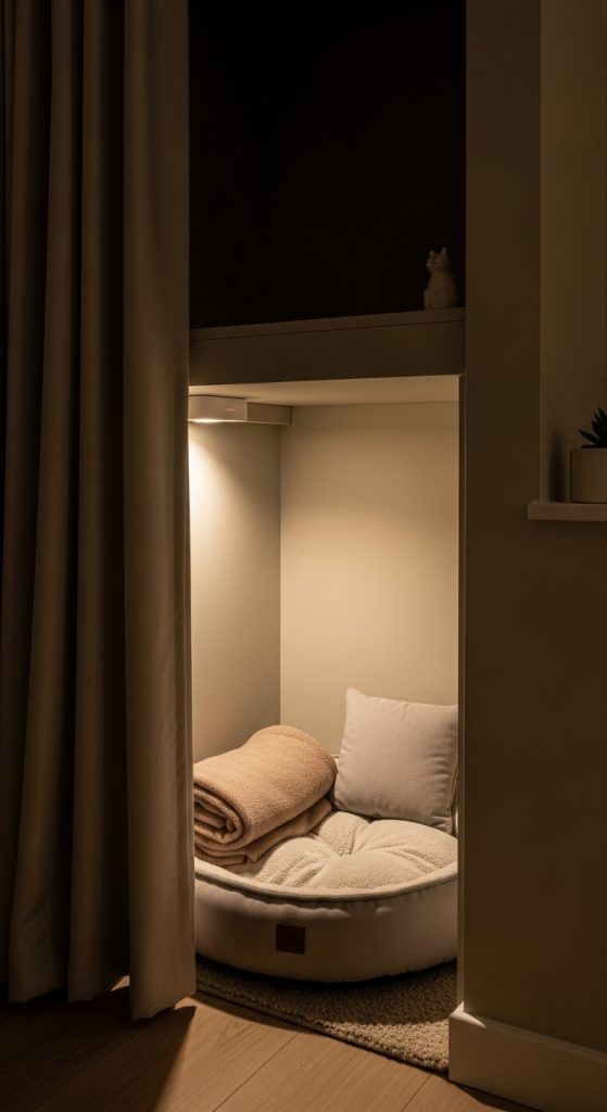 A simple, cozy closet with soft bedding, low lighting, and privacy for your cat.