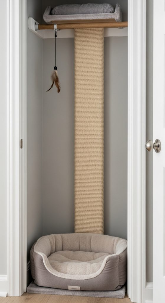 - Attach a sturdy scratching post or rope pole along one side of the closet.