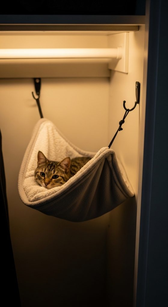 A suspended cat hammock inside a closet offers a floating, cozy sleeping spot.