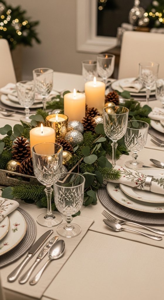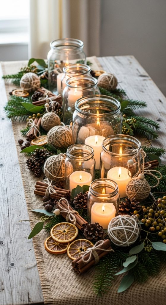 - Combine elements like candles, pinecones, ornaments, and greenery.