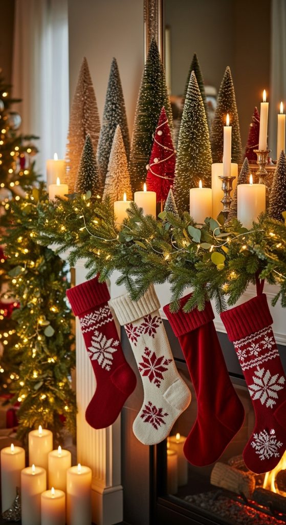 Transform your mantel into a festive showcase using garlands, candles, stockings, and figurines.