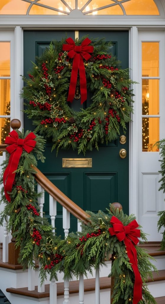 - Hang a traditional wreath on your front door with a festive ribbon.
