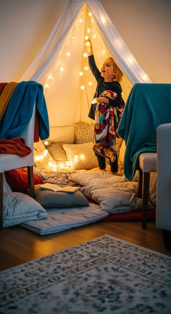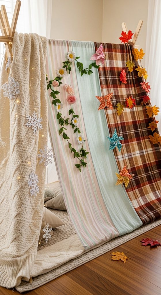 Make your play tent a year-round feature by changing it with the seasons! For winter, add thick blankets, string lights, and snowflake decorations. In spring, use floral garlands and soft pastels. Summer calls for airy cotton and beachy hues, while autumn can feature plaid patterns and faux leaves.