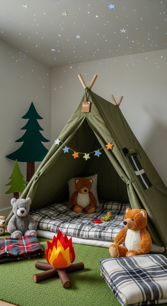 Use soft plaid blankets and a mini sleeping bag to complete the cozy camping vibe. This type of play tent encourages storytelling and imaginative play, from camping under the stars to exploring imaginary forests.