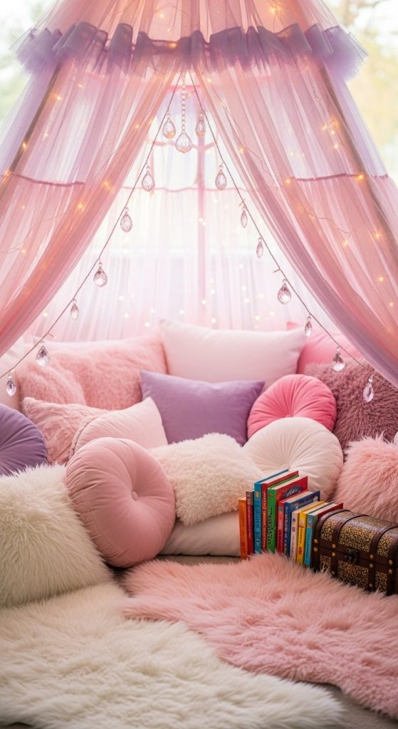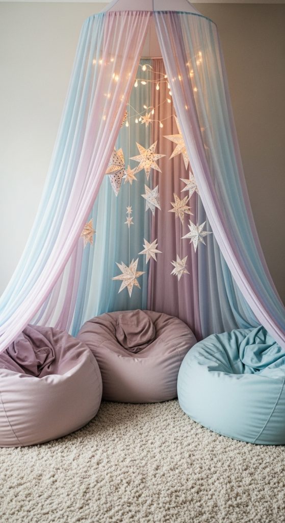 A canopy-style tent hung from the ceiling is perfect for tight spaces. Use a flowy fabric in pastel shades like dusty pink, sage green, or ivory. Drape it to form a circular cocoon over a soft rug or bean bag.
