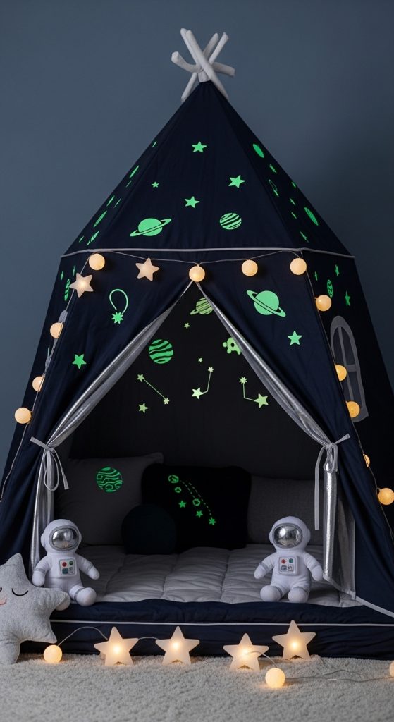 Inside, add glow-in-the-dark stickers and LED lights that mimic stars. A few astronaut plush toys or space-themed books make it even more fun.