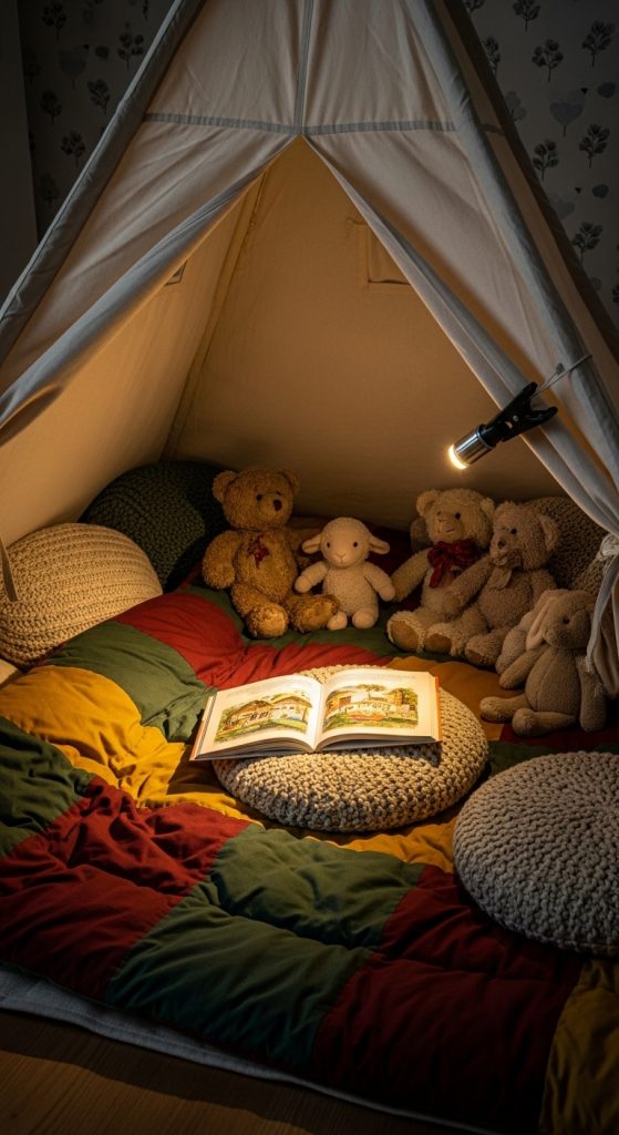 For book-loving toddlers and preschoolers, a small reading tent is a perfect haven. Choose a tent with soft walls or a canopy setup. Inside, layer a thick quilt, floor cushions, and a few stuffed animals.