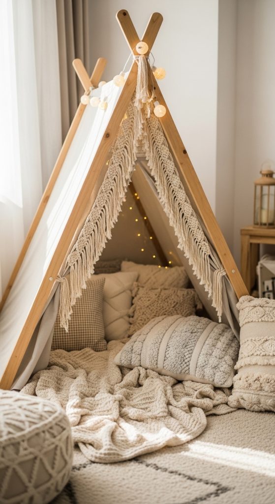 A bohemian-inspired play tent instantly adds warmth and character to any room. Choose a neutral-toned canvas teepee with wooden poles, fringes, and macramé detailing. Fill the inside with soft throw blankets, textured cushions, and fairy lights to make it cozy.