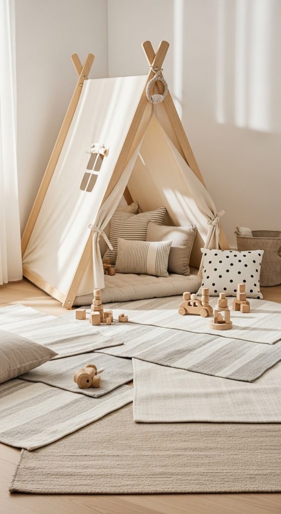 If you prefer clean lines and natural tones, a minimalist play tent will fit perfectly in your home. Think light wood frames, cream or beige canvas, and cotton textiles.