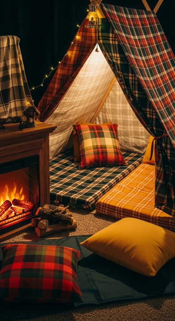 Inside, use cozy blankets, flannel pillows, and even a tiny faux fireplace prop for imaginative play. The cabin aesthetic gives kids a sense of adventure while maintaining a homey vibe.