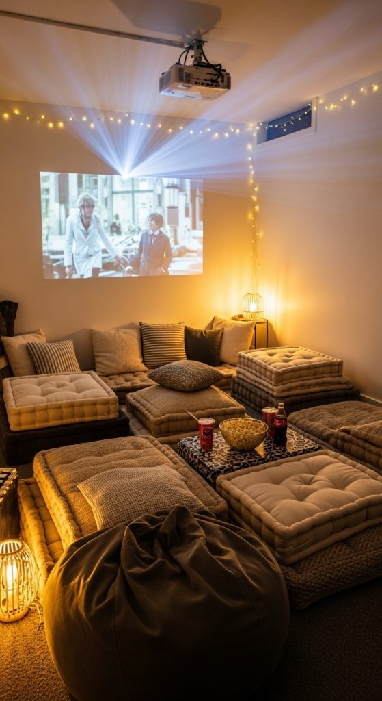 Why It Works: DIY setups provide flexibility and affordability while keeping the basement theater cozy and functional.