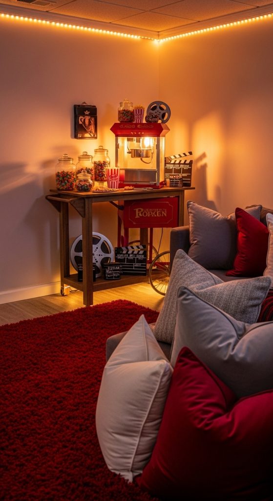 Adding a snack station or popcorn bar enhances the theater experience.