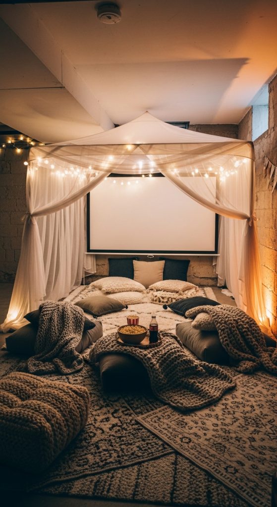 Creating a cozy theater corner in your basement doesn’t require a massive renovation. Whether you prefer a classic setup, a rustic cabin vibe, or a whimsical tent-inspired nook, thoughtful design, layered lighting, and soft textures make a world of difference.