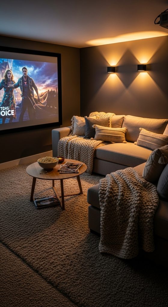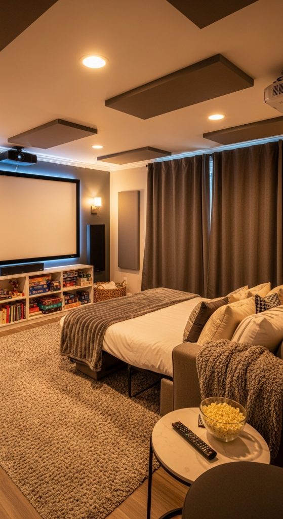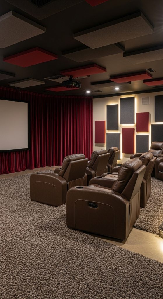 Why It Works: Enhancing acoustics makes the basement theater immersive while maintaining a cozy environment.