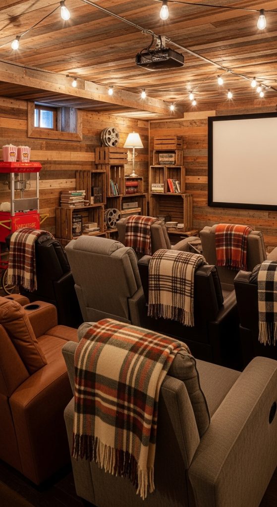 A rustic style adds warmth and charm to a basement theater corner.