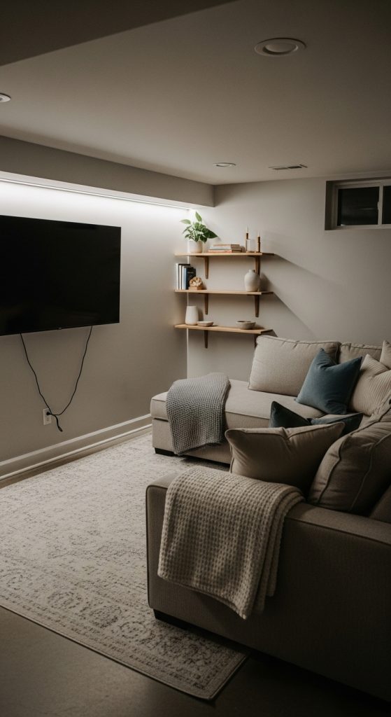 Why It Works: Minimalist design keeps the space feeling open and cozy without overwhelming small basements.