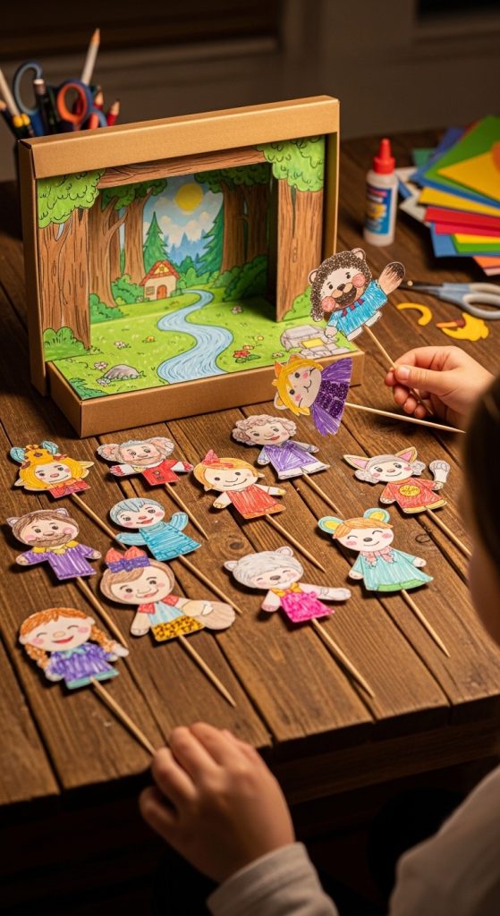 Create characters using paper cutouts and attach them to sticks or straws.