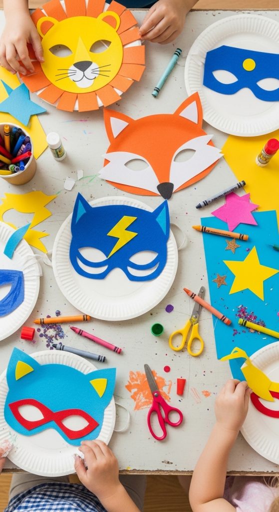 Cut out mask shapes from cardboard or thick paper. Let kids decorate them as animals, superheroes, or fantasy characters.