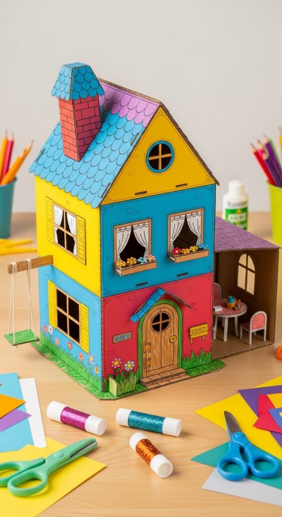 Kids can cut and assemble paper into house shapes, adding doors, windows, and roofs.