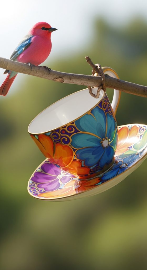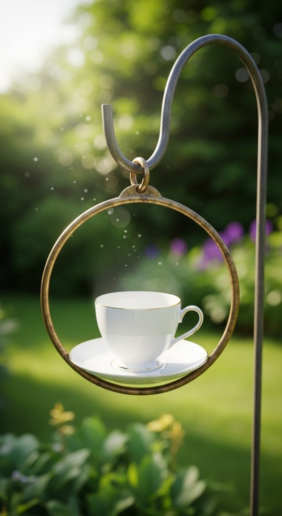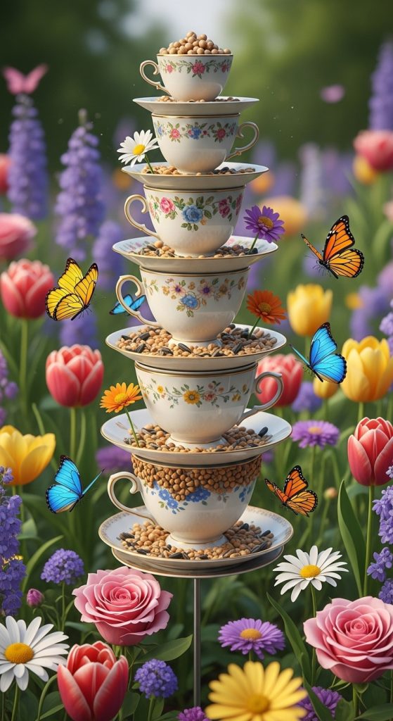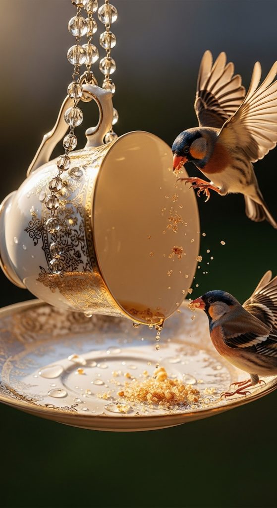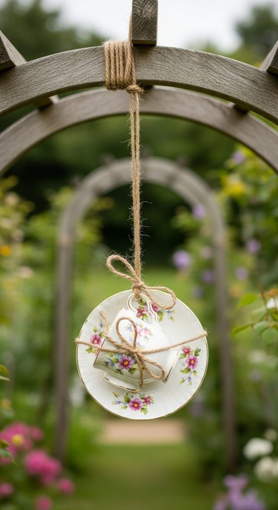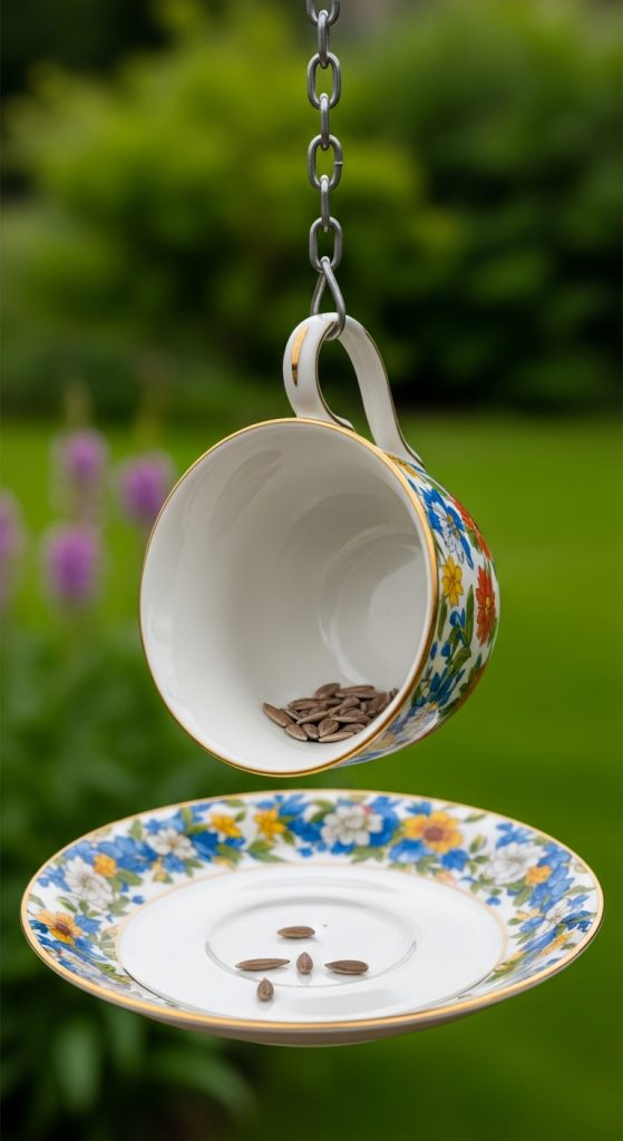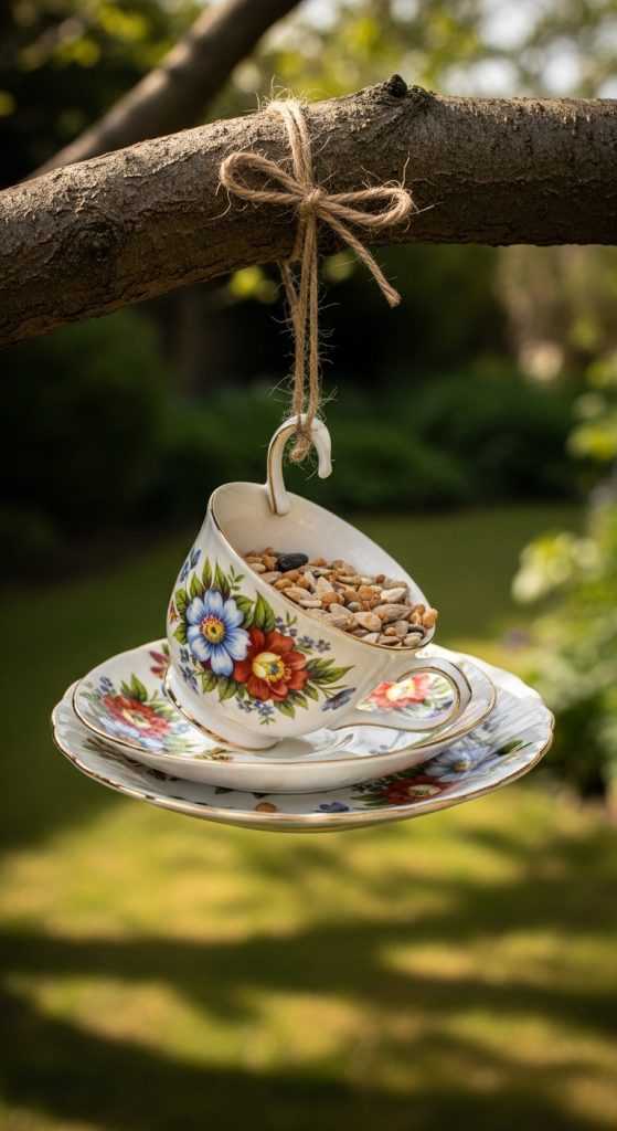 Create a vertical garland of 3–5 teacups hanging in a row from a branch or pergola. Adds whimsy and invites more birds.
