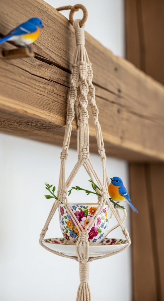 Place a teacup and saucer in a handmade macrame plant hanger. Adds vintage-boho flair to any garden or balcony.