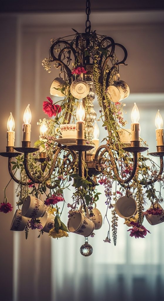 Repurpose an old chandelier frame, hanging multiple teacups at varying heights. A beautiful garden centerpiece!