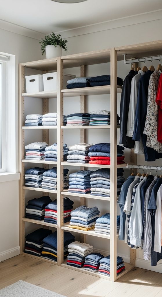 An open shelf wardrobe display uses visible shelving instead of closed storage. Clothes are neatly folded and placed on shelves for easy access.
