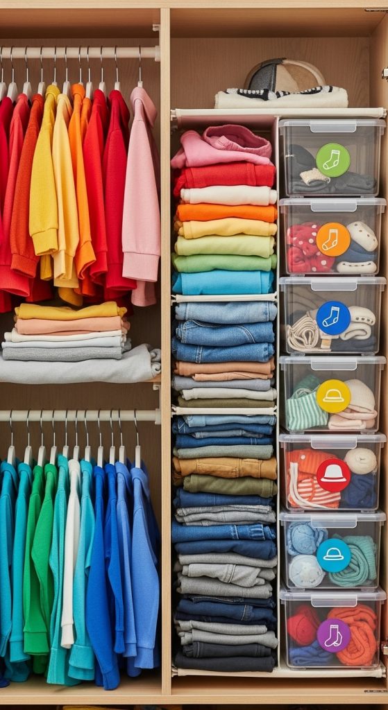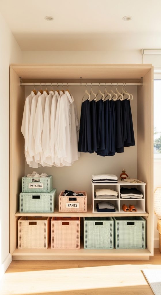 This method reduces clutter and makes it easy to manage clothing categories. Kids can quickly pick the bin they need without searching through the entire wardrobe.
