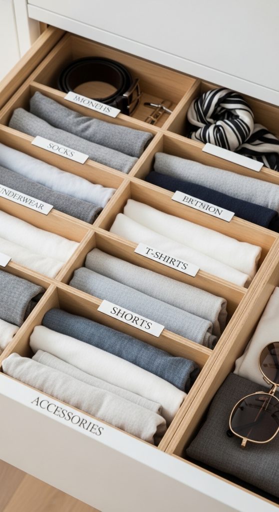 You can use plastic dividers, wooden inserts, or even DIY cardboard sections depending on your budget. The goal is to create clear separation between items.