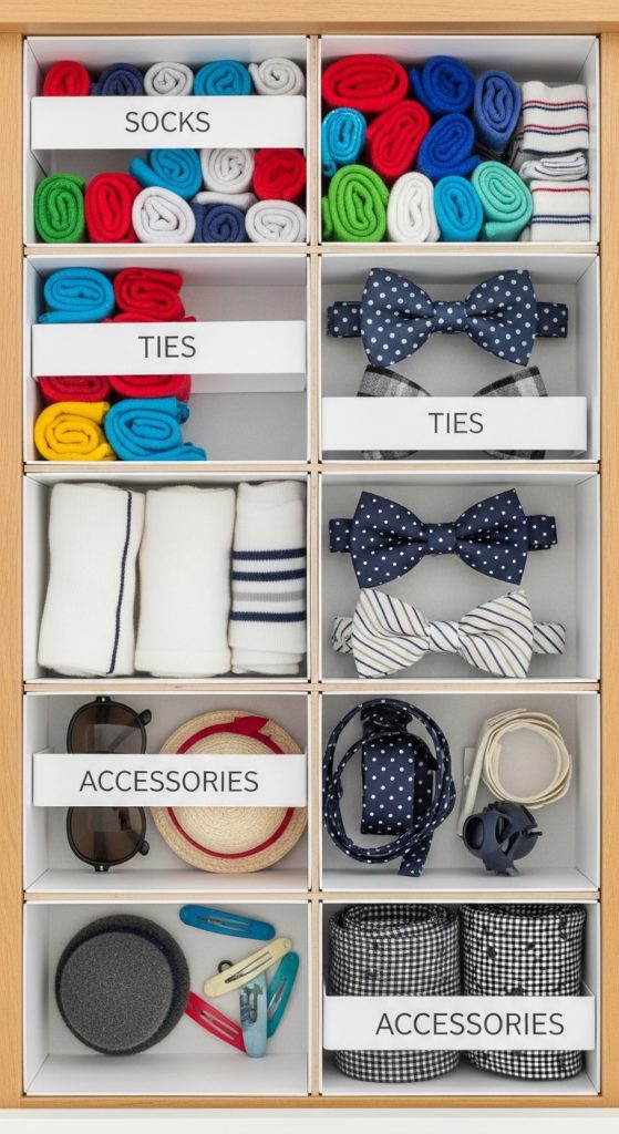 A labelled drawer division system is perfect for organizing small kids’ clothing items that often get mixed up. Socks, underwear, ties, handkerchiefs, and accessories are usually the first things to create clutter in wardrobes.