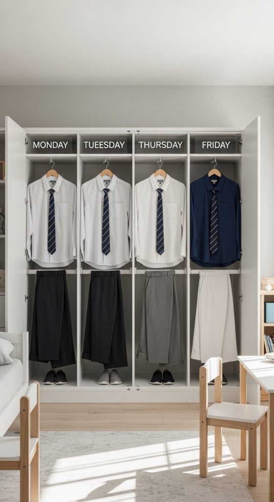 Parents can prepare outfits in advance for the entire week, placing each set in its own section. This reduces daily decision-making and ensures children are always ready.