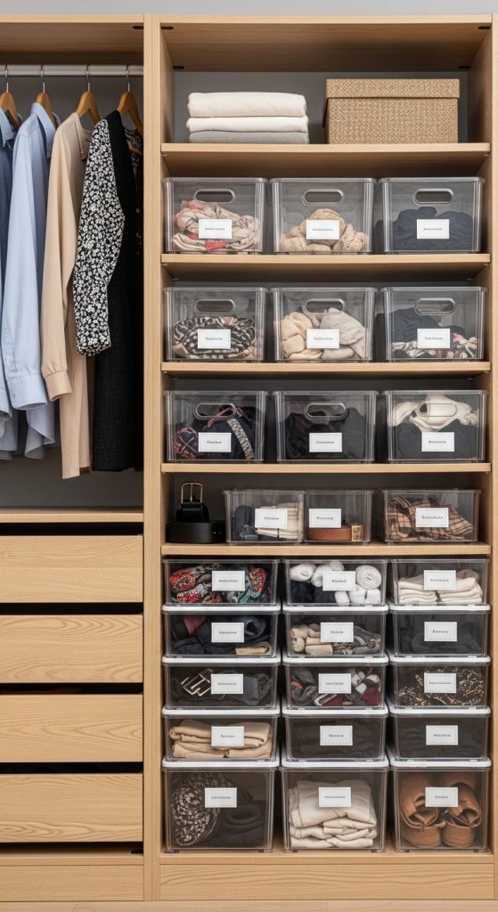 These bins can be placed on shelves or inside the wardrobe. Clear bins make it easier to see contents, while labeled bins improve organization even further.