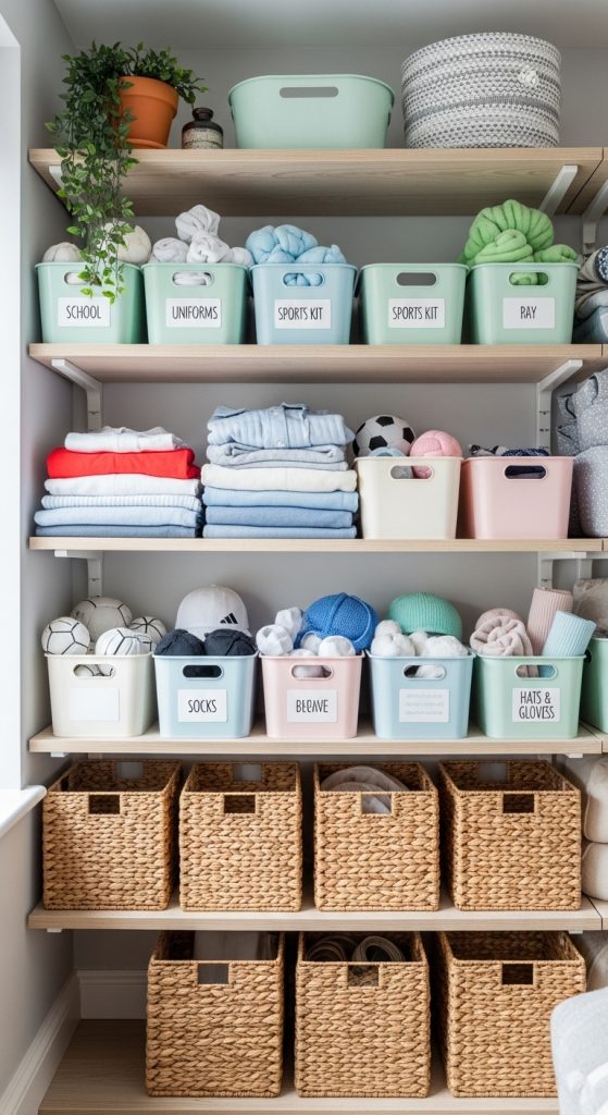 Mini storage bins are a simple and effective way to categorize kids’ wardrobe items. Each bin can hold a specific type of clothing such as school uniforms, sportswear, seasonal clothes, or accessories.