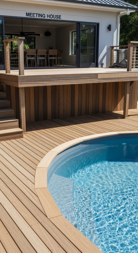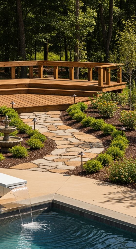 Combine a wooden deck with stone paths, garden beds, and small shrubs around the pool. This design looks organic and blends naturally into the yard, making the pool area feel like a hidden retreat.