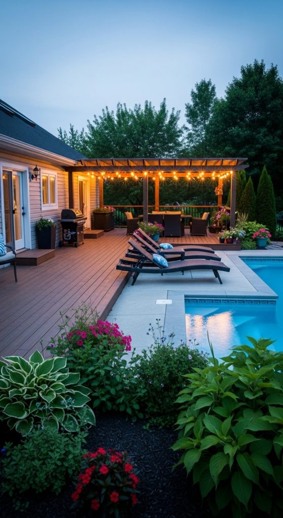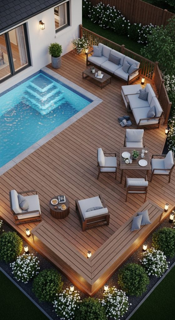If your pool is placed slightly higher than your yard, build a two-level deck: the upper level aligns with your house and the lower level wraps around the pool. This creates natural zones for lounging, dining, and swimming.
