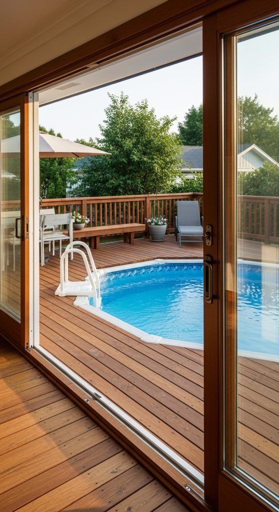 Design a spacious wooden deck that wraps around half or all of your above ground pool and connects directly to your patio doors. This seamless flow makes it easy to step outside your living room and jump straight into the water.