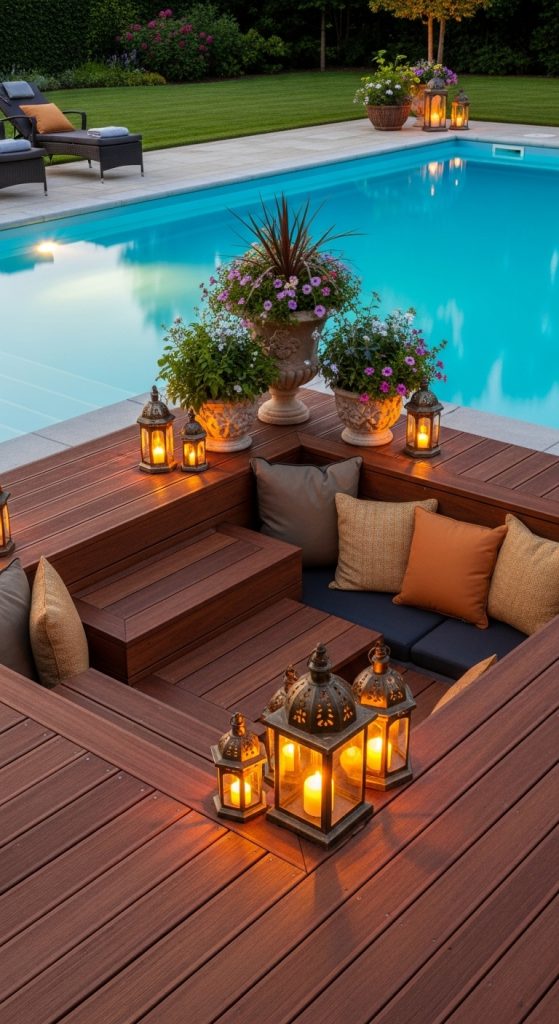 Build a deck that steps down around the pool to create a cozy, sunken seating zone. Add cushioned benches, lanterns, and planters to make this a favorite hangout spot.