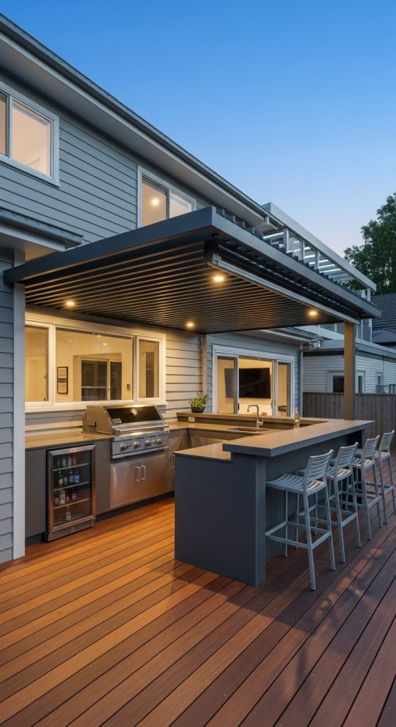 Turn your pool deck into an entertainment hub by adding a built-in grill, mini-fridge, or bar along the section closest to the house. This setup makes it easy to host pool parties without going inside.