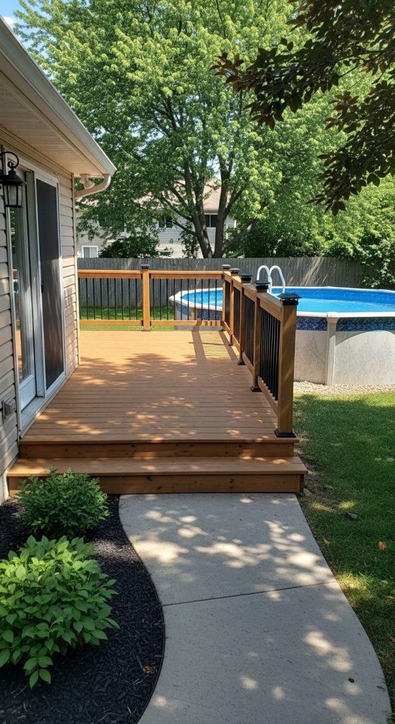 If space is limited, design a partial deck that connects from your house and wraps around one side of the pool. This still creates an inviting spot for lounging or sunbathing without overwhelming a smaller yard.
