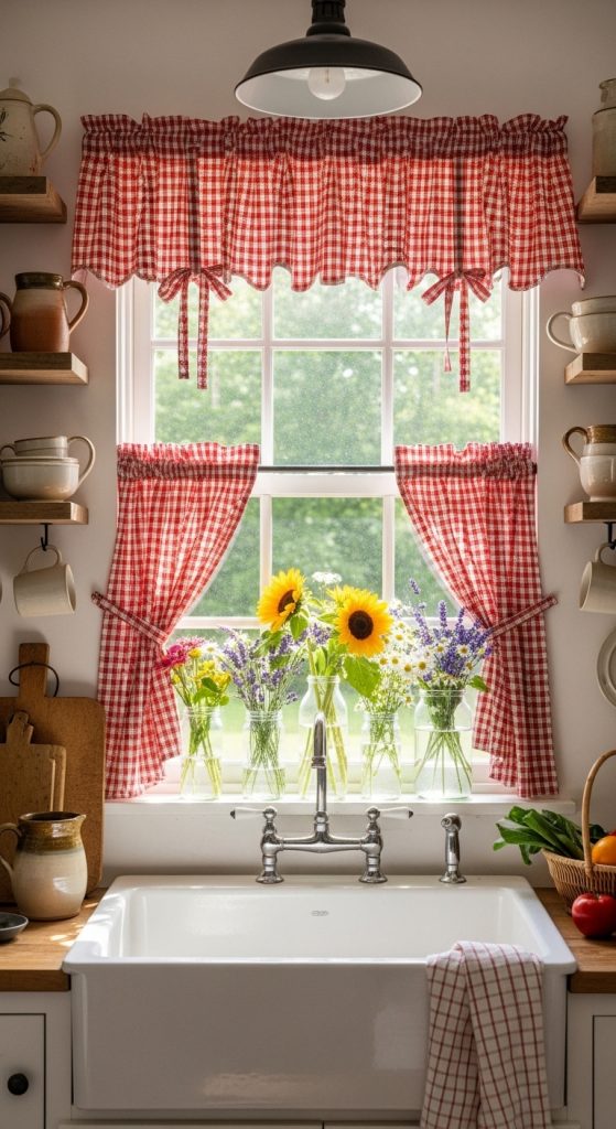 Gingham is cottagecore royalty — café curtains in red, sage, or faded blue bring the countryside indoors, especially when paired with farmhouse sinks or wooden counters.