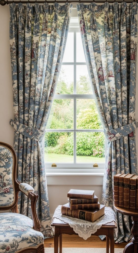 Toile (pastoral scenes) or delicate botanical prints in faded ink-blue, dusty green, or sepia evoke timeless countryside charm.