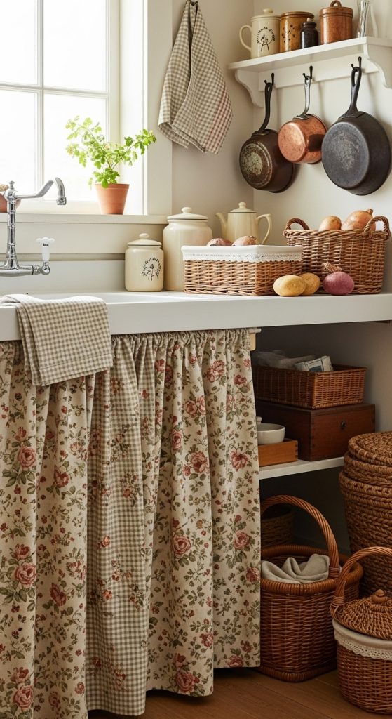 Use cottagecore-style fabric panels (gingham, floral, linen) as “curtain skirts” to hide open shelving or under-sink storage.