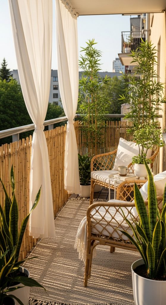 If you love greenery, consider using plants as privacy screens. Tall potted plants, trailing vines, or even vertical garden walls can provide a lush barrier between you and the outside world. Another option is to use reed or wicker balcony coverings for railings, which instantly soften the look while offering additional coverage.