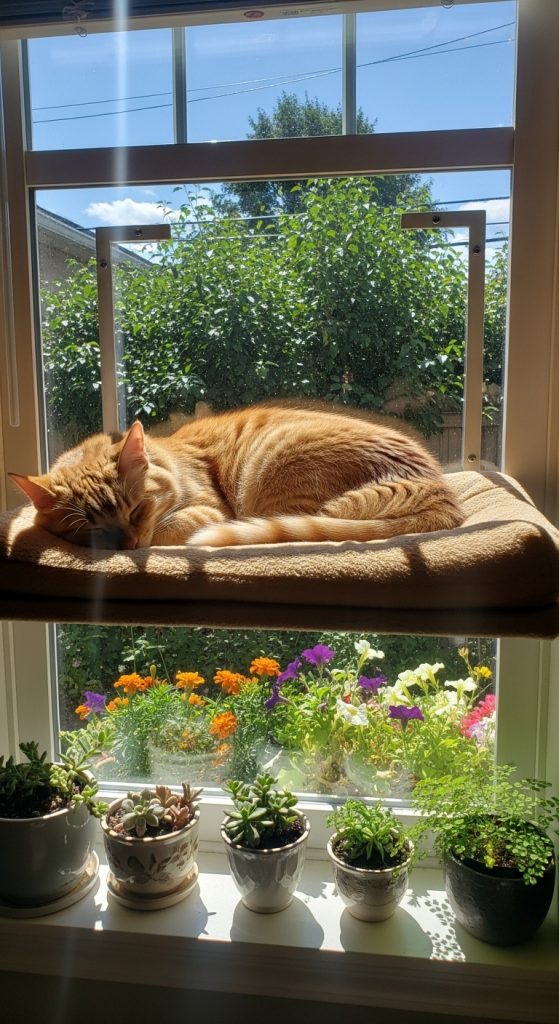 Install a shelf or hammock right by the window so your cat can sunbathe and watch the world outside. Bonus points for a view with birds!