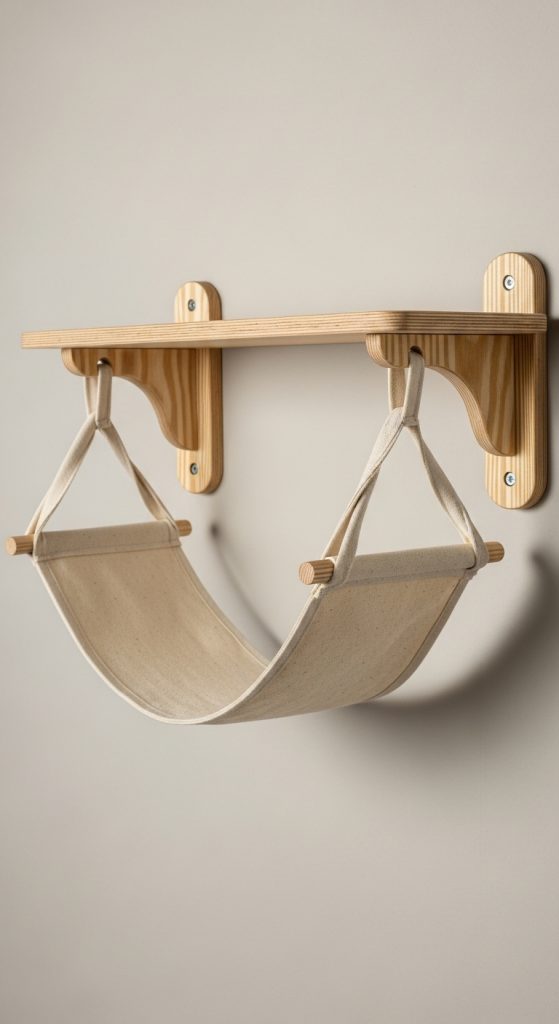 Add a hammock-like shelf between two wall brackets for a cozy resting place. Perfect for cats who like to lounge after climbing.