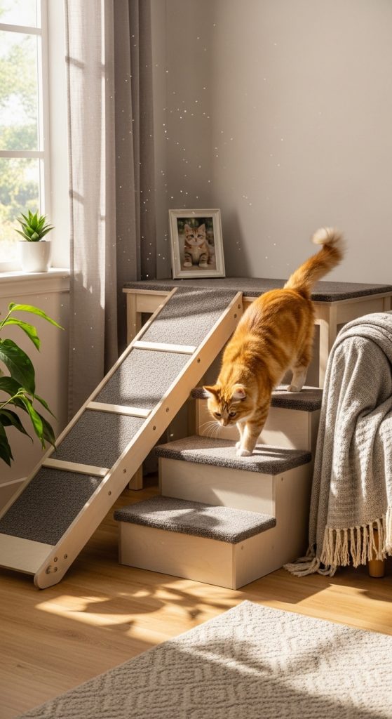 For older cats or kittens who may struggle with big jumps, install short ramps and stairs that still let them climb but with less effort.