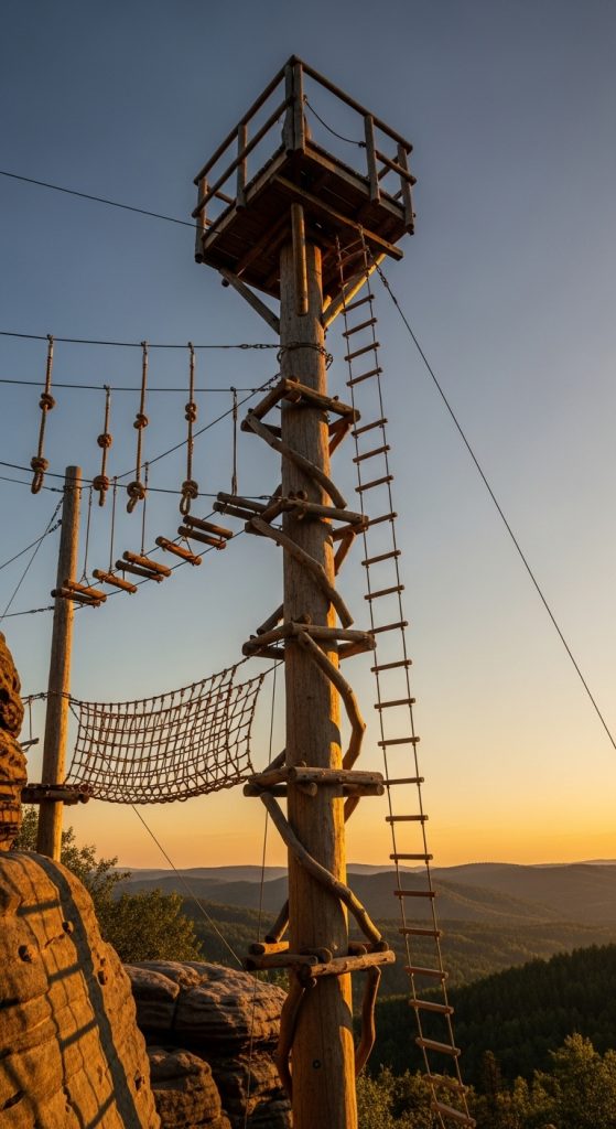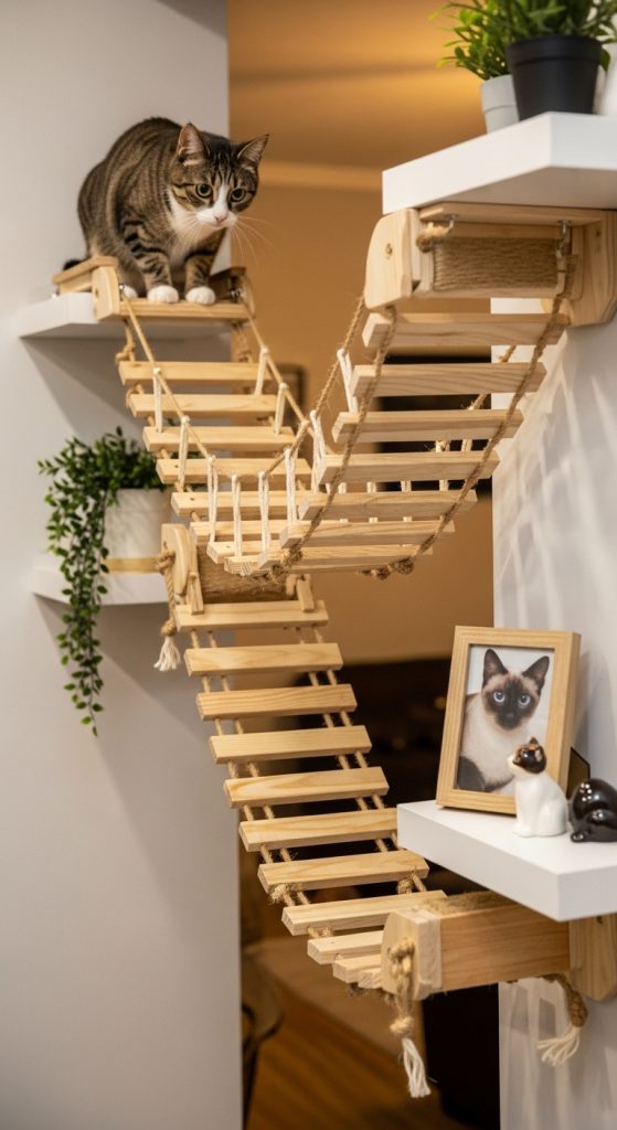 Create a hanging bridge between two shelves or walls for adventurous cats. Use sturdy wood or rope ladders with side rails for stability.