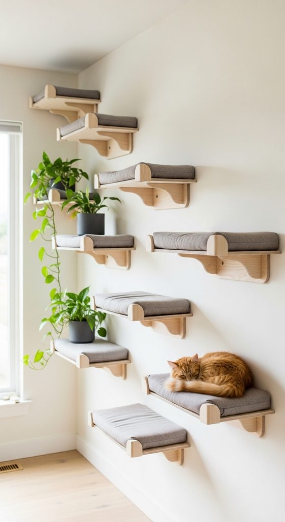 Install simple floating shelves at staggered heights so your cat can leap between them. Use non-slip surfaces for safety and add a few cushions for comfort.