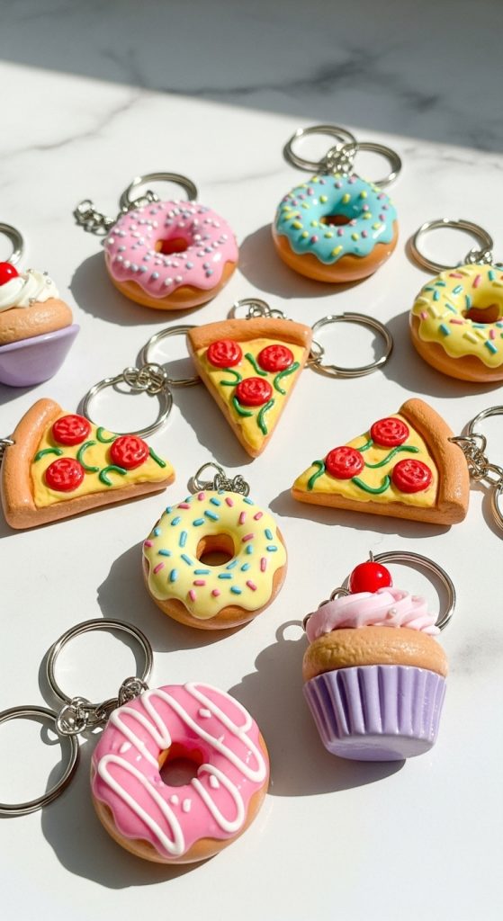 Create tiny clay versions of favorite foods like pizza slices, donuts, cupcakes, or ice cream cones. Add pastel colors and glossy varnish for a fun, kawaii-inspired vibe.